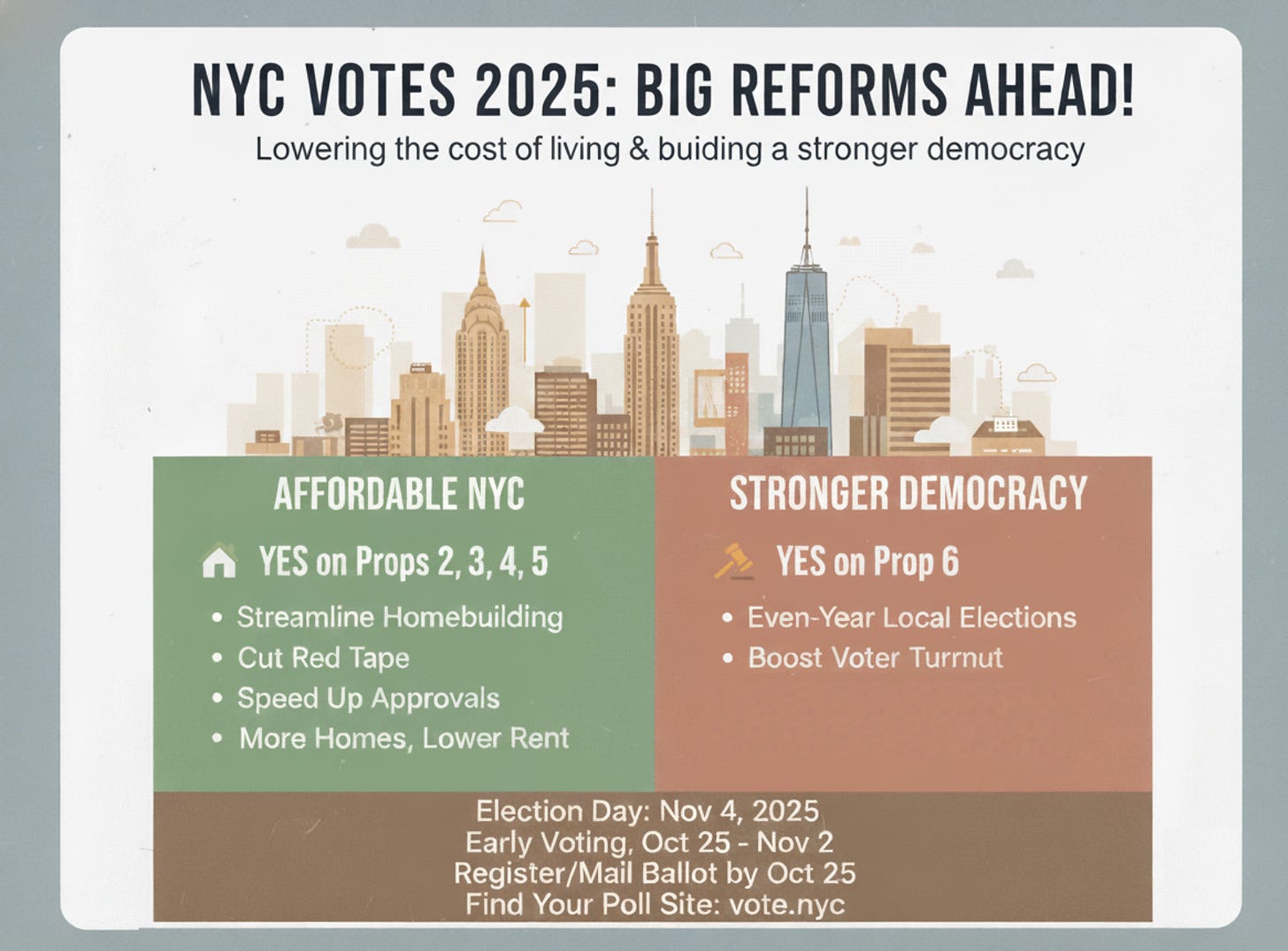 Given New York’s severe housing shortage, I strongly recommend voting YES on all four housing propositions to help get more homes built, and bring the cost of living down.